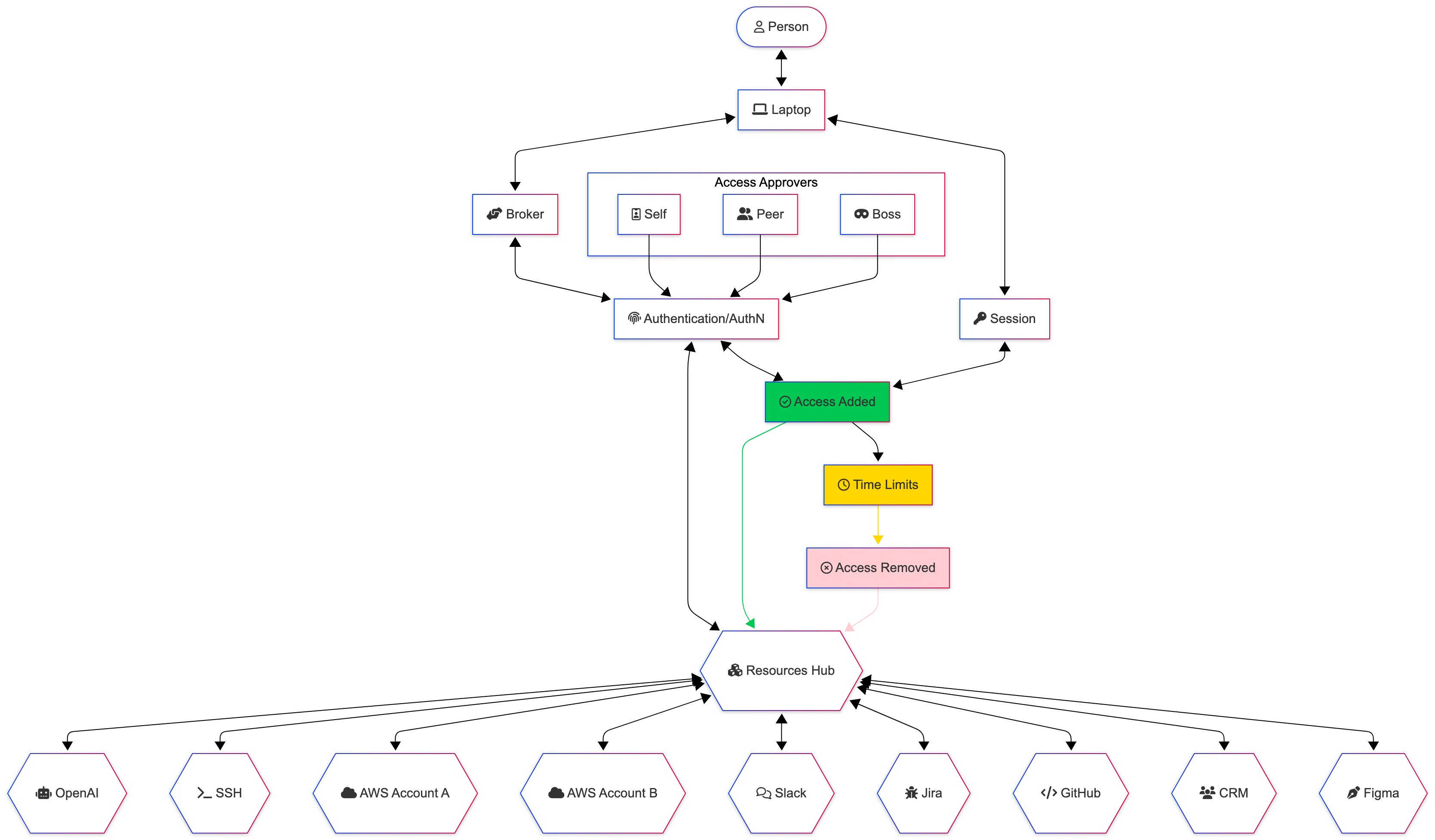 brokeris a system used to manage the process; the current buzzword used by Gartner etc isCloud Access Security Broker(CASB). It’s the brains of the operation in this example, and does all the significant connecting between the systems.Session is the session — access to the system(s) until they (individually and/or collectively) expire or where access is revoked (e.g. someone being granted more permissions than they need, and that being rescinded to replace with fewer permissions)